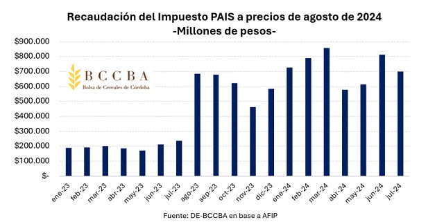 La recaudación del Impuesto PAIS en el mes de julio del corriente año aumentó 94% en términos reales, con respecto al mismo mes del 2023. Sin embargo, si comparamos los primeros siete meses, la recaudación en términos reales se incrementó 265%.