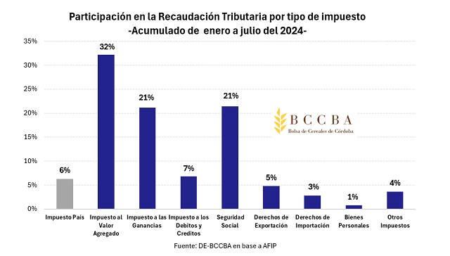 La baja del impuesto PAIS representa el 74% de lo recaudado en derechos de exportación en los primeros siete meses del año. Lo cual podría plantearse de la siguiente manera: de mantenerse el impuesto PAIS en el 17,5%, se podrían haber bajado los derechos de exportación en un 74% para igual efecto en la recaudación tributaria.