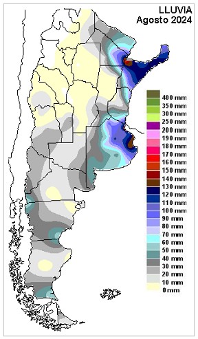 El mapa que resume las lluvias del mes de agosto, desde el punto de vista meteorológico, no presenta una distribución desfavorable. Las lluvias, como es normal para la época, tendieron a favorecer la franja este, pero como mencionamos, con núcleos fuertes, claramente superiores a los valores estadísticos. En el medio hubo un salteo destacado que se nota desde el centro de SF hacia el centro de ER, esta lengua seca si ha sido perjudicial, dado que sume a toda la región en un estado de sequía. Que llueva poco en CB durante el mes de agosto, no es extraño y por otra parte, las lluvias sobre LP y oeste bonaerense, no fueron copiosas pero estuvieron. Luego hay que evaluar las mejoras que las mismas producen en términos de balance hídrico y allí si salta la memoria del paso previo del invierno. Si pudiésemos ignorar el comportamiento desde mediados de mayo hasta comienzos de agosto, este último período debemos considerarlo como favorable, es decir, se ha evidenciado un aumento en la actividad atmosférica, todo promovido por agentes dinámicos de escala regional.
