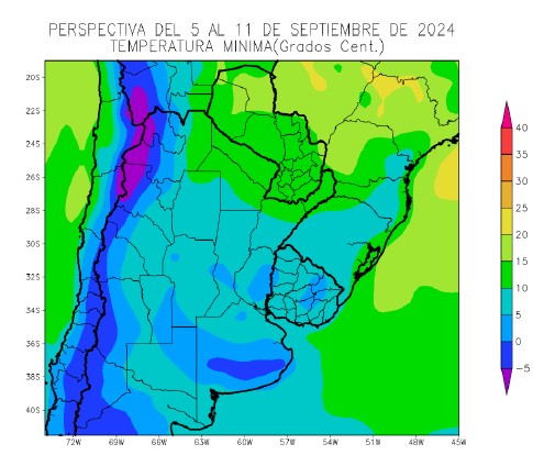 Debido a la entrada de vientos polares en los días precedentes, la perspectiva comenzará con temperaturas mínimas por debajo del rango normal en la mayor parte del área agrícola, con heladas localizadas sobre todo el oeste y el sur, y heladas generales sobre las zonas serranas del oeste y las serranías bonaerenses, mientras sólo su extremo norte observará valores en el rango normal. Los vientos del Trópico retornarán con vigor, extendiéndose sobre el norte y el centro-norte del área agrícola, provocando registros muy sobre lo normal, mientras el centro-sur observará valores normales, y el sur observará registros algo bajo la media estacional, debido al inicio del paso de un frente de tormenta. Un Frente de Pampero recorrerá el área agrícola, pero al encontrar escasa humedad atmosférica y condiciones estables, producirá registros preponderantemente escasos a nulos sobre la mayor parte del área agrícola, salvo algunos focos aislados de valores moderados, mientras volverán a darse condiciones para nevadas (señaladas en rojo obscuro) sobre la Cordillera Sur.