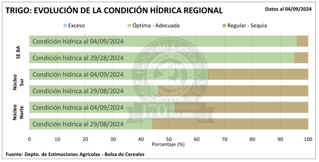 De las 6,3 MHa estimadas, El 82,6% presenta condición de cultivo Normal/Excelente, y el 53,1% se encuentra bajo condición hídrica Adecuada/Óptima. El 87,2% transita desde macollaje en adelante.