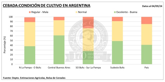 Asimismo, durante los últimos quince días, de las 1,3 MHa de cebada implantadas a nivel nacional, el 83% registra una condición hídrica Adecuada/Óptima, con un 85% presentando una condición de cultivo Normal/Buena. Estas condiciones se dan con un 75 % transitando entre macollaje y encañazón. Sobre el Norte de La Pampa-Oeste de Buenos Aires, si bien las lluvias se concentraron sobre el margen este, la humedad en el perfil mejoró, y el 70% de los lotes están entre macollaje y encañazón, con un 89% bajo una condición de cultivo Normal/Buena. En el sur del área agrícola, las bajas temperaturas han ralentizado el desarrollo del cereal. El centro y sudeste de Buenos Aires disponen de buena humedad en el perfil, lo que permite que el 91 % de los lotes presenten una condición de cultivo Normal/Buena, con un 76% en pleno macollaje. Colaboradores informan que se han podido cumplir con los planes de fertilización sobre dicha etapa fenológica. Por el contrario, sobre el Sudoeste de Buenos Aires-Sur de La Pampa, donde la humedad en el perfil es limitada, el 68 % de los lotes han iniciado el periodo de macollaje.