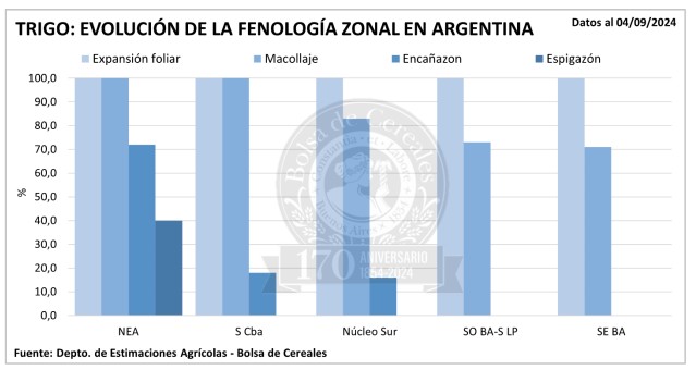 En cuanto al trigo, la condición hídrica mejoró en 4 puntos porcentuales a escala nacional, con aumentos significativos de la oferta hídrica sobre el centro-este y sur del área agrícola, mientras que, sobre el norte y el oeste, excluidos del aporte de las lluvias, continúan bajo condiciones de humedad cada vez más restrictivas. A nivel nacional se observa una demora en la llegada a encañazón de 12,5 p.p. debido a bajas temperaturas. No obstante, en las zonas alcanzadas por las lluvias se están llevando a cabo las labores de fertilización correspondientes y, en consecuencia, esperan que con el aumento de las temperaturas, el cultivo desarrolle y entre en etapas críticas con alto potencial.