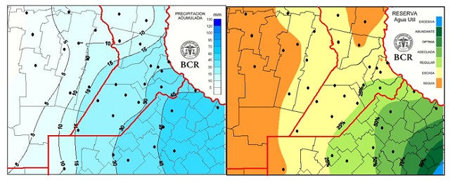 El NE bonarense recibió los mayores acumulados. El mayor registro fue de 52 mm y se midió en Baradero. Le sigue Pergamino con 51 mm. Pero en el resto de la región los totales variaron entre 2 y 30 mm con un marcado gradiente en disminución hacia el noroeste, donde los registros fueron nulos. Las reservas de agua en el suelo mejoraron en el sudeste, pero se mantienen regulares a escasas en el resto y avanza la condición de sequía sobre la franja oeste.