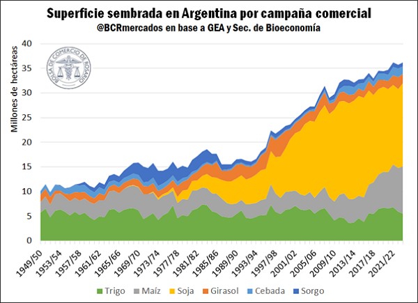 El área sembrada con los granos mencionados en la campaña 2023/24 habría ascendido a 36,2 millones de hectáreas, aumentando un 1,2% interanual y quedando apenas 0,1% por debajo del récord que se alcanzó en el ciclo 2020/21.