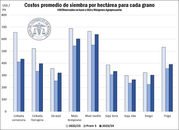 Teniendo en cuenta la elevada superficie sembrada a nivel nacional, y los costos de los insumos que, como se mencionó, disminuyeron respecto a los máximos relativos alcanzados en el ciclo previo, resulta relevante a continuación hacer un análisis del costo promedio para cada uno de los cultivos considerados. El costo de producción por hectárea para cada grano en la campaña 2023/24 habría sido, en promedio, de US$ 436 para la cebada cervecera y US$ 398 para la forrajera, US$ 320 para el girasol, US$ 603 para el maíz temprano y US$ 639 para el tardío, US$ 334 para la soja de primera y US$ 265 para la de segunda, US$ 303 para el sorgo y U$S 391 para el trigo. Esto se calcula a partir de los datos de la Guía Estratégica para el Agro (BCR) y de la revista Márgenes Agropecuarios al momento de afrontar la siembra de cada cultivo para cada zona de producción, y realizando un promedio ponderado en función de su participación en el área sembrada a nivel nacional.
