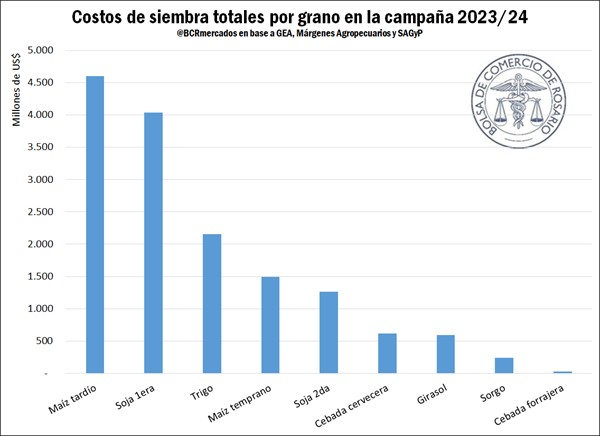 Al multiplicar estos promedios por hectárea por la superficie sembrada estimada para cada grano, según cálculos propios de GEA y la Secretaría de Bioeconomía, se determina que los productores argentinos habrían incurrido en un costo total de 15.024 millones de dólares durante la campaña 2023/24. Este costo se distribuye de la siguiente manera: US$ 4.598 M para el maíz tardío, US$ 4.032 M para la soja de primera, US$ 2.158 M para el trigo, US$ 1.492 para el maíz temprano, US$ 1.262 para la soja de segunda, US$ 615 M para la cebada cervecera, US$ 595 M para el girasol, US$ 242 M para el sorgo y U$S 30 M para la cebada forrajera.