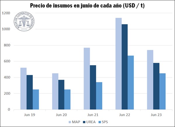 En el siguiente gráfico se puede apreciar lo elevados que habían resultado los precios de los insumos al momento de comenzar las siembras de la campaña 2022/23, tomando como referencia tres insumos comúnmente utilizados en la producción de granos: el MAP (fosfato monoamónico), SPS (superfosfato simple) y urea, en el mes de junio de cada año. En la campaña 2023/24 los precios retrocedieron: el MAP bajó un 35% interanual, el SPS un 33% y la urea un 45%. Es importante mencionar que estos precios constituyen solo una referencia, dado que solo se toma un mes como referencia