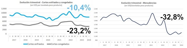 Los precios promedio de estas tres grandes divisiones han evolucionado a la baja los últimos años, siendo los cortes enfriados los de más valor y los que menor precio han perdido, a U$S 8.015/TN los precios del primer trimestre 2024 resultan -10,4% inferior al primer trimestre de 2017. Los cortes congelados, a U$S 3.540/TN, han recortado más del -23% de su valor y las menudencias a U$S 1.290/TN, redujeron casi -33% en siete años.