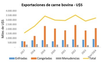 El precio promedio de exportación de res bovina con hueso en lo que va de 2024 alcanza U$S 3.000/TN. Cuando se observa la composición de las exportaciones de carne bovina, 28% de las divisas ingresadas corresponden a carnes enfriadas, 65% a carnes congeladas y 7% a menudencias.