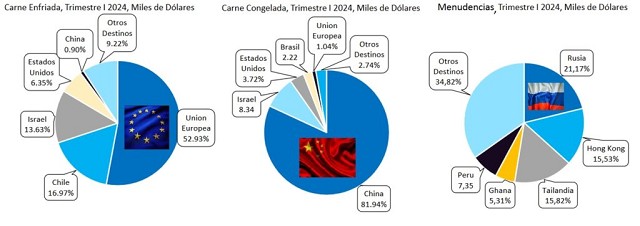Dada la gran diferencia entre precios y el peso de cada uno de estos tres grupos en el ingreso de divisas, veamos los destinos más destacados de donde provienen dichas divisas. En los siguientes gráficos puede verse el protagonismo de la Unión Europea con casi 53% del aporte de divisas de carnes enfriadas, mientras China aporta casi 82% de las divisas por carnes congeladas. Las menudencias, más atomizadas que las demás, tienen a Rusia como principal aportante de divisas.
