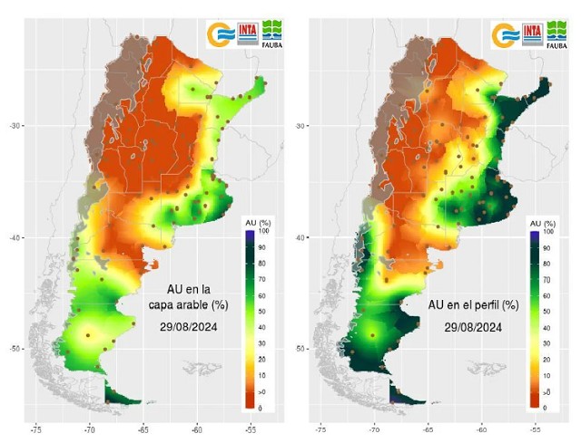 Según mapas publicados por el SMN, el agua útil (AU) es escasa en los perfiles de toda la superficie provincial y nula en la capa arable, lo que explica, junto con la ausencia de precipitaciones, la aparición de síntomas de estrés hídrico en los cultivos.