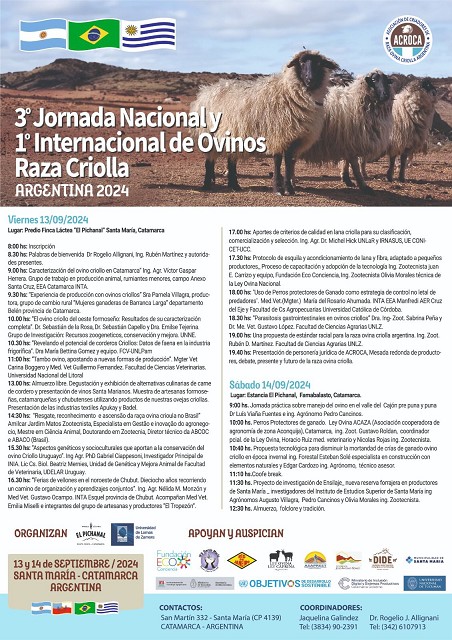 El 13 y 14 de septiembre se realizará la Tercera Jornada Nacional y la Primera Internacional de la raza Ovina Criolla en la localidad de Santa María de la provincia de Catamarca, con el fin de analizar todo el potencial de las ovejas criollas.