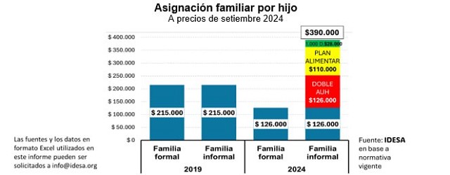 En setiembre del 2024 la familia con empleo formal cobra por asignación por hijo $126.000 mientras que la familia informal recibe por AUH $390.000.