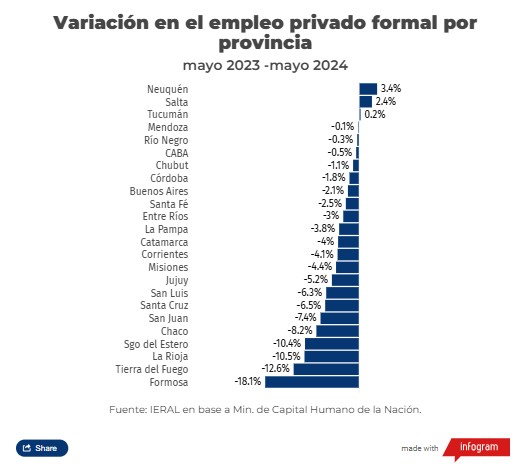 La variación del empleo privado formal por provincia entre mayo de 2023 y mayo de 2024 revela fuertes disparidades regionales. Aunque la mayoría de las provincias han experimentado retrocesos, algunas, como Neuquén y Salta, han registrado un crecimiento en la generación de empleo, con incrementos del 3,4% y 2,4% respectivamente. Estos resultados reflejan el potencial económico de estas provincias, impulsado por la diversificación de sus matrices productivas, la atracción de inversiones y el fortalecimiento de políticas públicas han contribuido a dinamizar el mercado laboral en dichas regiones.