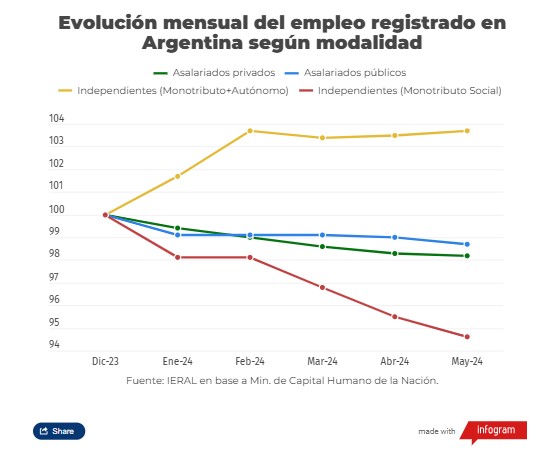Al desglosar las modalidades de empleo registrado, en lo que va del año, se observa un incremento del 4% en el número de trabajadores independientes: los autónomos, especialmente responsables inscriptos, añadieron 32.116 nuevos empleos y los monotributistas, régimen simplificado para pequeños contribuyentes, sumó 56.621 nuevos trabajadores. Cabe destacar, que un contexto de alta inflación, muchos monotributistas no tuvieron otra opción que pasar a ser autónomos, fenómeno que comenzó a revertirse con la actualización de los topes que entraron en vigencia a partir del 1° de agosto, tras la aprobación de la Ley Bases y el denominado Paquete Fiscal. No obstante, el monotributo social experimentó una caída del 5,4%, con 33.872 registros menos. Este régimen permitía a sus beneficiarios acceder a programas sociales como Potenciar Trabajo, la Asignación Universal por Hijo y la Tarjeta Alimentar.