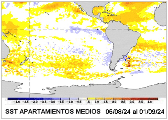 Por otra parte, las costas bonaerenses y del norte de la Patagonia se mantienen algo frías, pero ya con mayor presencia de la corriente de Brasil sobre la zona, que deja una condición bastante heterogénea sobre el sector. La circulación del sudeste, que puede aparecer en este período, no tendría una incidencia significativa como para promover heladas tardías en la zona núcleo. Eventualmente puede haber más riesgo con flujos del sudoeste, pero por lo pronto el viento de esta dirección no ha sido el más persistente en la transición intermensual. Por otra parte, es posible que durante lo que resta de septiembre y durante octubre se observen mayores calentamientos en el litoral uruguayo y brasileño.