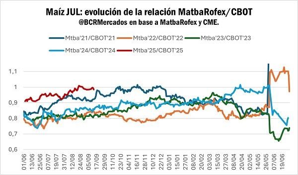 La ratio entre las cotizaciones futuras en MatbaRofex y Chicago, sería la más alta desde la unificación del mercado a término argentino, alcanzando prácticamente la paridad entre su análogo norteamericano. Esto último, teniendo en cuenta que el cereal argentino debe afrontar retenciones a la exportación por el 12% de su valor FOB, mientras que el estadounidense no cuenta con aranceles a la exportación.