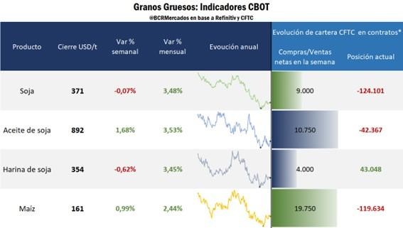 En este escenario, los fondos especulativos no han dejado de jugar un rol preponderante, habiendo recortado fuertemente sus posiciones cortas en futuros agro, aunque aún manteniéndose con una cartera netamente vendida.