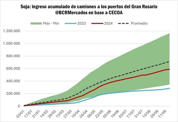 Así el cuadro general a mediados de septiembre indica que se han comprado casi 28 Mt de soja, restando por comprometer el 43% de la oferta total de la oleaginosa, manteniéndose levemente por detrás del promedio de las últimas campañas.
