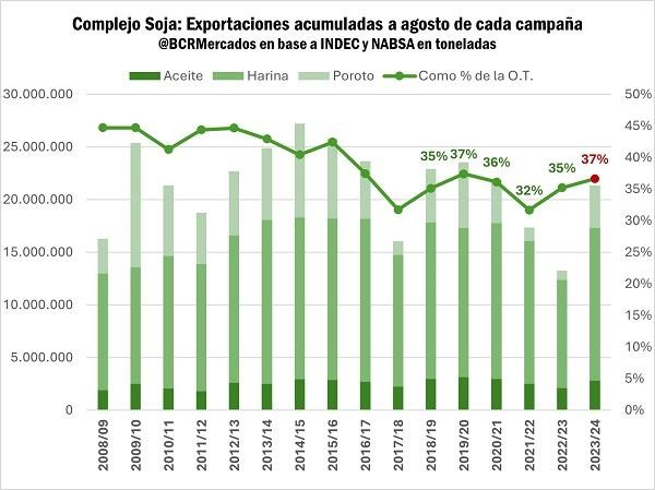 Dicha presión de demanda se logra vislumbrar sobre el tonelaje exportado durante toda la campaña hasta agosto, llegando a embarcar el mayor volumen en tres años como complejo exportador.