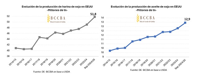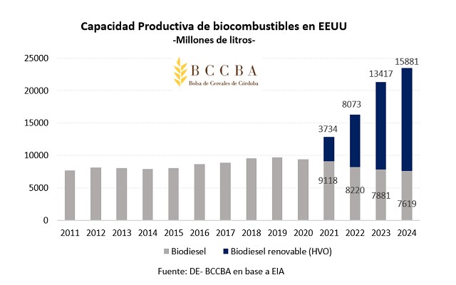En la producción estadounidense de HVO los principales insumos utilizados son el aceite de soja, el aceite de cocina usado (ACU), y sebos no comestibles. El primer insumo se obtiene de la industria interna, mientras que el ACU se importa principalmente desde China. Así, el crushing estadounidense sería record dado el crecimiento en la producción de HVO lo que implicaría una mayor producción de harina de soja, generando excesos en el mercado internacional.