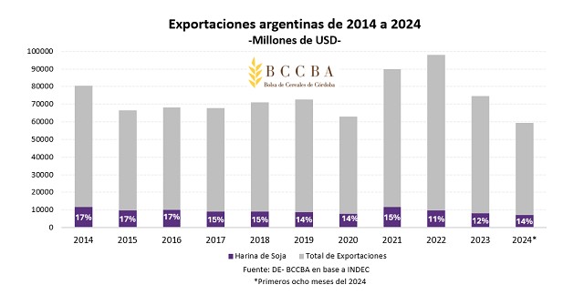 Por su parte, el consumo mundial se incrementaría en menor medida que la producción, generando un exceso de oferta en el mercado global que provocaría presiones bajistas sobre el precio. Este escenario impactaría sobre la economía argentina, dado que la harina de soja es el principal producto exportable del país, y, en consecuencia, el principal generador de divisas, con una participación promedio del 14% en el total de los ingresos generados por las exportaciones en los últimos diez años.
