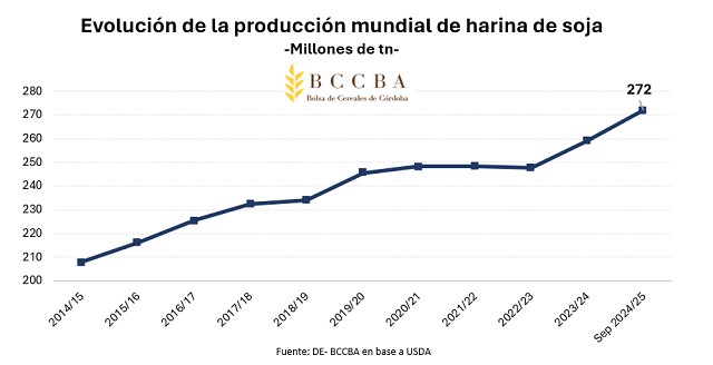 A nivel internacional, el Departamento de Agricultura de Estados Unidos en su último informe correspondiente al mes de septiembre, proyectó un valor récord para la producción de harina de soja de 272 millones de toneladas para la campaña 2024/25. Este incremento estaría explicado en mayor parte por el aumento en la producción estadounidense (6%) y argentina (13%), respecto al ciclo anterior.