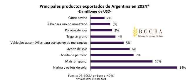 Si consideramos el primer semestre del 2024, el 55% del total de las exportaciones argentinas estuvieron explicadas por la harina de soja (14%), maíz en grano (10%), aceite de petróleo (7%), aceite de soja (6%), vehículos automóviles para transporte de mercancías (5%), trigo en grano (4%), porotos de soja (3%), oro para uso no monetario (3%) y carne bovina (2%), mientras que, el resto de otros productos, componen el total.