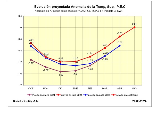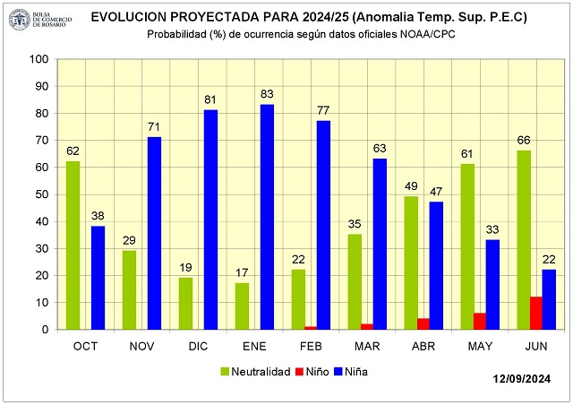 —Para el seguimiento mensual que publica GEA/BCR, se usaron los últimos datos de la NOAA para actualizar la curva que exhibe el impacto que tendría “La Niña”. La nueva curva reafirma que el mayor impacto se daría entre noviembre y febrero. Hay que destacar que la actualización muestra una intensidad menor, una “Niña” que está más cerca de ser leve que moderada de corta duración. En abril ya estaríamos en “neutralidad”.
