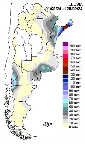 Se ve una mayor consistencia pluvial en el centro norte de la Mesopotamia y eso es una condición necesaria para alcanzar un octubre pluvialmente más productivo. Por lo pronto la oferta de agua de septiembre define claros sectores inconexos con buenos milimetrajes de lluvia, con un marcado salteo en la franja central.