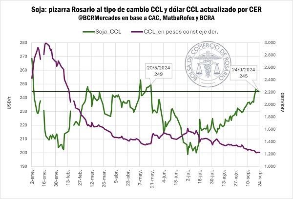 En consecuencia, dada la fortaleza de la pizarra en pesos, expresado al tipo de cambio financiero la tonelada de soja se ha negociado en torno a valores máximos del 2024. Aunque sin perjuicio de que, en pesos en términos reales esté en mínimos desde el 2019.
