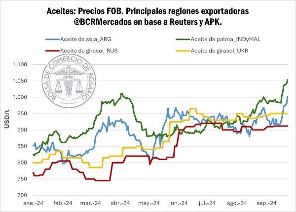 Las cotizaciones sobre el mercado internacional descuentan cada vez más este contexto, convalidando la suba en los precios de aceites en general, y concretamente marcando ganancias del 9% en Chicago para el aceite de soja. Este marco se refleja en las cotizaciones para las principales regiones exportadoras, encareciéndose el aceite alrededor del mundo.