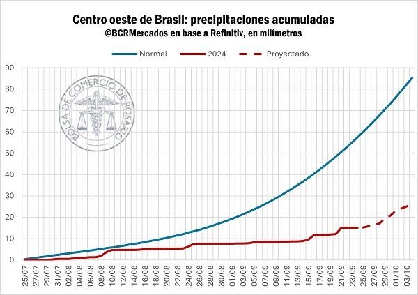 En términos gráficos, sobre la región del centro oeste de Brasil, que explica casi la mitad de la producción, las precipitaciones acumuladas desde fines de julio se encuentran 70% detrás de los niveles normales de agua que suelen caer sobre la región a esta altura.
