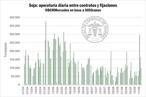 La semana pasada, durante el miércoles, se operaron 296.000 toneladas de soja entre contratos y fijaciones, siendo uno de los volúmenes más altos anotados diariamente durante toda la campaña.