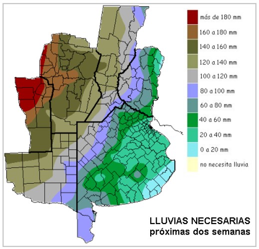 Se puede ver el avance de la isolínea de 80mm (color lila) hacia el este, tomando gran parte de la zona oeste de ER y casi todo el oeste de la zona núcleo. Este valor, ya es un requerimiento altamente improbable de satisfacer en términos estadísticos y define una situación aumentada de estrechez hídrica para los cultivos de la fina que ingresan a floración. El mapa presenta una demanda de lluvias más razonable para gran parte del este bonaerense.
