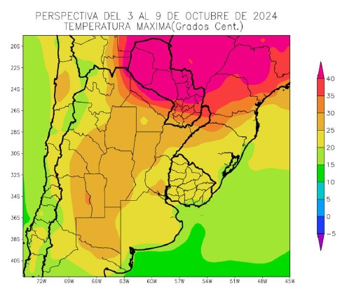 La perspectiva comenzará con tiempo fresco debido a la entrada de vientos polares en los días precedentes, pero los vientos del Trópico retornarán con vigor, causando el ascenso de la temperatura, con registros sobre lo normal en el norte del área agrícola, y dentro de lo normal, en el centro y el sur, mientras la franja atlántica observará el ingreso de aire marino, causando temperaturas algo bajo la media estacional. El paso de un frente provocará precipitaciones y tormentas sobre el norte del área agrícola, con registros moderados sobre gran parte del oeste, pero la mayor parte de la Región Pampeana y el Uruguay recibirán aportes escasos, mientras el norte de la Patagonia experimentará nevadas (señaladas en rojo obscuro). Junto con el frente arribarán los vientos polares causando temperaturas mínimas por debajo del rango normal en todo el oeste, el centro y el sur del área agrícola, con heladas localizadas sobre las Serranías Bonaerenses y el sudeste del Uruguay, y heladas generales sobre las zonas serranas del oeste, mientras sólo su extremo norte observará valores en el rango normal.