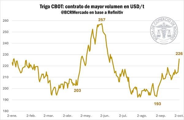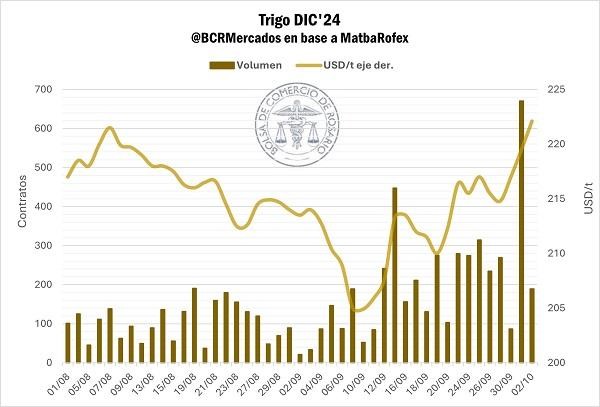 El valor de los futuros en MatbaRofex concatenaron tres jornadas consecutivas al alza, para llegar a marcar el volumen operado más importante para el mes de octubre en un contrato de trigo nuevo de su historia, cuando DIC’24 ajustó en USD 219,5/t.