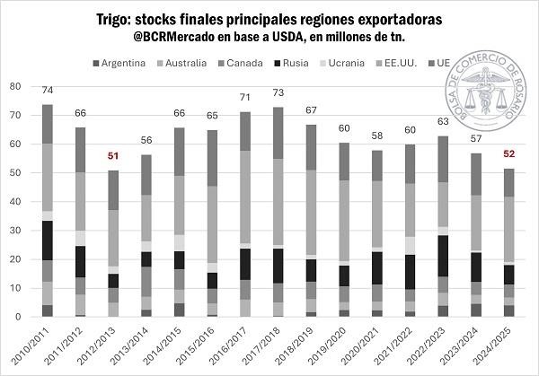 En este contexto, y partiendo de los últimos datos disponibles según las proyecciones del Departamento de Agricultura de Estados Unidos (USDA), aún con estimaciones optimistas para la cosecha sobre el hemisferio sur, los stocks finales para la campaña 2024/25 de las principales regiones exportadoras, serían los más bajos en doce años.