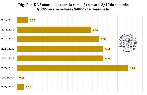 A contramano de los últimos años, las registraciones de declaraciones juradas de ventas al exterior (DJVE) no habían aparecido, cuando en promedio ya se anotaban más de 5 Mt a esta altura. Finalmente, durante el miércoles se hicieron las primeras registraciones, con 60.000 toneladas a embarcar a partir de diciembre, 250.000 toneladas desde febrero y 200.000 toneladas desde marzo.