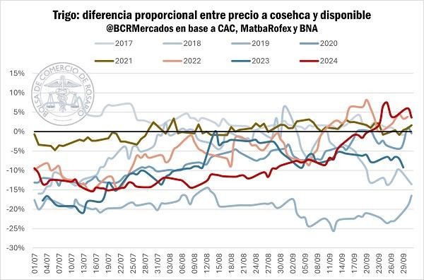 La combinación de un contexto de demanda limitada para la mercadería disponible junto con la incertidumbre climática en torno a la producción para la nueva campaña, han llevado a que los valores negociados a cosecha sean mayores que las ofertas de compra por la mercadería disponible, invirtiendo así una relación de precios que normalmente debiese ser negativa. Hoy el mercado por trigo se encuentra en carry, operándose en el término USD 10/t arriba de lo negociado por trigo en octubre. En términos proporcionales estaríamos hablando de la diferencia porcentual más importante, en por lo menos, ocho años.