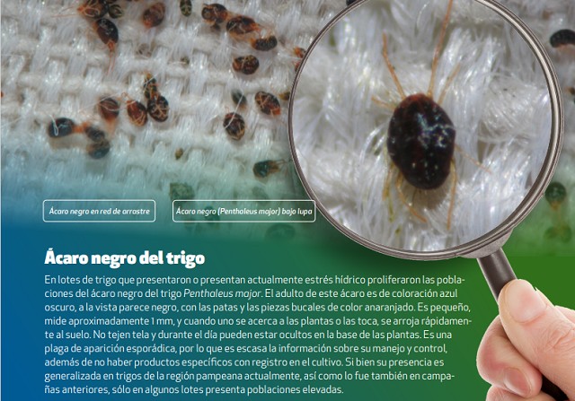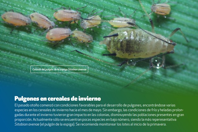 Los pulgones en cereales se mantienen en bajo número, al igual que el mes de julio, siendo el pulgón de la espiga, Sitobion avenae, la especie más frecuente. El ácaro negro continúa presente en trigo.