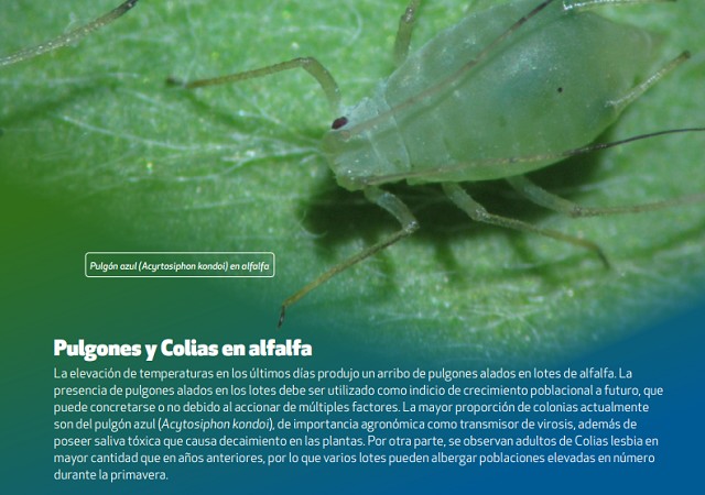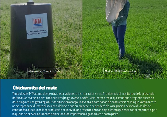 En pasturas de base alfalfa, se registra la presencia de pulgón azul. Se está realizando el muestreo para la detección de individuos de la chicharrita del maíz (Dalbulus maidis) sobre distintos sustratos, el cual arroja ausencia de la plaga en los lotes de la estación experimental monitoreados.