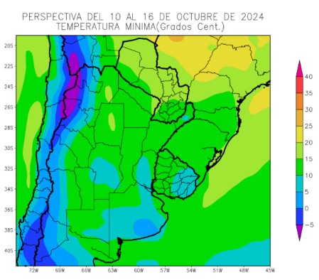Debido al ingreso de una masa de aire polar en los días precedentes, la perspectiva comenzará con temperaturas mínimas algo bajo lo normal en gran parte del área agrícola, con heladas generales en las zonas serranas del oeste, y heladas localizadas sobre las Serranías Pampeanas. Los vientos del Trópico retornarán con vigor, extendiéndose sobre el norte del área agrícola, produciendo temperaturas máximas muy sobre lo normal, mientras el centro y el sur observarán valores normales, y el Litoral Atlántico experimentará registros algo bajo lo normal a causa de la entrada de vientos marinos. Paralelamente, se producirán precipitaciones de frente caliente, sin que baje la temperatura, provocando un amplio foco de registros abundantes sobre el nordeste del área agrícola, con posibles focos de tormentas, y registros escasos sobre la mayor parte del resto, salvo focos abundantes aislados sobre el NOA, el oeste de la Región Pampeana, y la Cordillera Sur.
