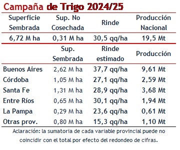 Con un área sembrada de 6,7 M de ha y esta estimación de 19,5 Mt, Argentina produciría lograría producir un 31 % más de trigo que lo que dejó la mala campaña pasada (14,5 Mt). El ciclo de trigo 2024/25 sigue posicionándose como la segunda producción más importante de las últimas 15 campañas, junto a la 2019/20, si se produce un cambio rotundo del clima en lo que resta de octubre y noviembre que sostenga estos valores de rindes estimados.