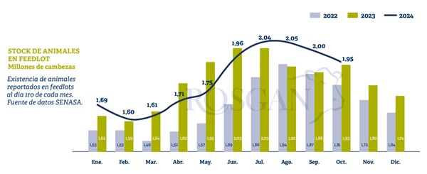 Al analizar la composición actual del stock por categorías, en relación al año pasado, se observa un mayor número de novillos, novillitos y toritos, que en conjunto crecen un 8,5% en nivel de encierre, a diferencia de los terneros que disminuyen en un 2%, sobre el stock registrado un año atrás.