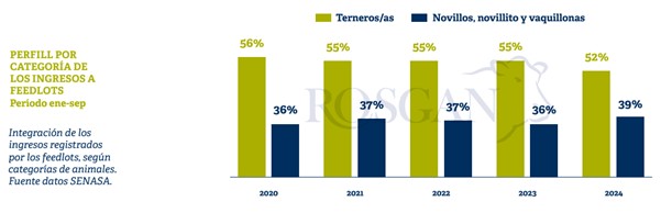 En efecto, si se analiza el perfil de animales ingresados a los feedlots para el mismo período del año, notamos que la proporción de terneros y terneras que ingresan año a año a los feedlots viene disminuyendo con relación a la proporción de animales más adultos, como novillos, novillitos y vaquillonas.