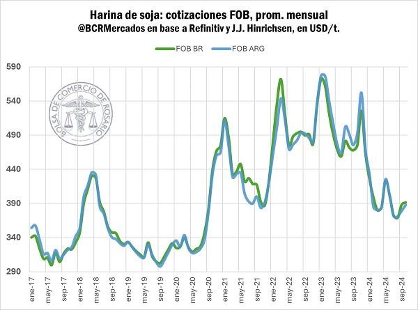 Contexto que se ha traducido en precios a lo largo de todo este año. Hoy los precios de exportación por embarques de harina de soja cotizan 33% por debajo del último pico de noviembre del 2023. Sin embargo, los guarismos actuales se encuentran aún por encima del promedio operado durante los cuatro años anteriores al comienzo de la pandemia.