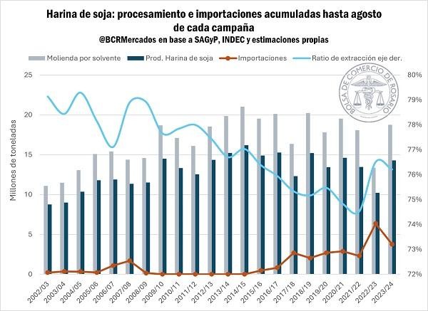 Por lo pronto, hacia el mes de agosto, se procesaron vía solvente 18,7 Mt de soja en lo que va de la campaña 2023/24, elaborándose en consecuencia 14,3 Mt de harina de soja, 40% más que a esta altura durante el año pasado y recobrando el nivel medio de procesamiento de campañas normales. A demás, la ratio de extracción promedio, entre molienda por solvente y elaboración de pellets llegaría al 76,2%, significativamente por encima del promedio de las últimas diez campañas, incrementando la eficiencia del proceso de crushing local, permitiendo obtener una mayor cantidad de harinas por cada tonelada de soja procesada.