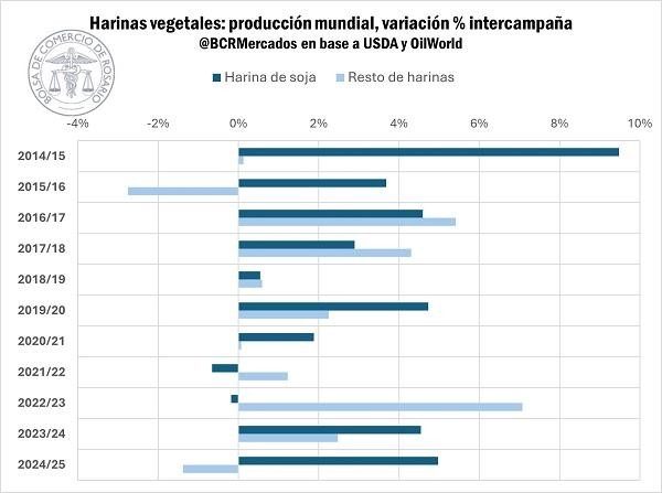 Sin embargo, la contracara de ello es que, dado la menor proporción de materia grasa del poroto de soja en comparación con el resto de las oleaginosas, la mayor demanda de crush de soja para producir más aceite termina presionando en gran medida la oferta de harina. En consecuencia, el aumento de la producción de harina de soja a nivel mundial más que compensaría el traspié productivo del resto de harinas vegetales.
